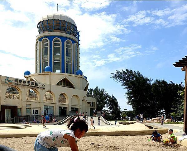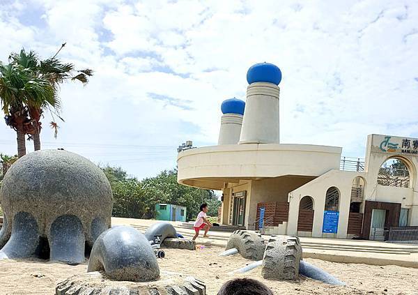 問我南寮到底哪裡好玩?2018年5月開幕的南寮遊客中心大沙坑很推薦親子活動,原本只是普通的遊客中心,經過整修後搖身一變變成親子熱門景點,大沙坑一直是小朋友的夢想樂園,這個沙坑很特別,利用石雕和廢棄的輪胎共融的方式,塑造出濃濃的海洋風,有烏龜、大章魚、螃蟹等海生動物陪伴在小孩左右,不時還搭配淺淺的水池,是夏天不可錯過的活動,整個設施氛圍營造出沙灘的感覺,又很安全,只是遮陽的地方較少,家長們可能要比較辛苦陪孩子在烈日下,當然沙坑旁邊要洗腳很方便,也記得要帶換洗衣物和毛巾來玩,會比較好唷!